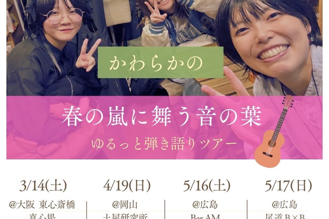 かわらかの×春田玄×「矢野ゾミ hijiya.1 2026年3月26日 開催日: 2026年4月19日カテゴリー: ライブ 2026/4/19 (SUN) 「春の嵐に舞う音の葉」 〜ゆるっと弾き語りツアー岡山編〜 open 18:30 start 19:00 charge ¥2,400- (+1d ¥600-) -act- かわらかの 春田玄 「矢野ゾミ もね助