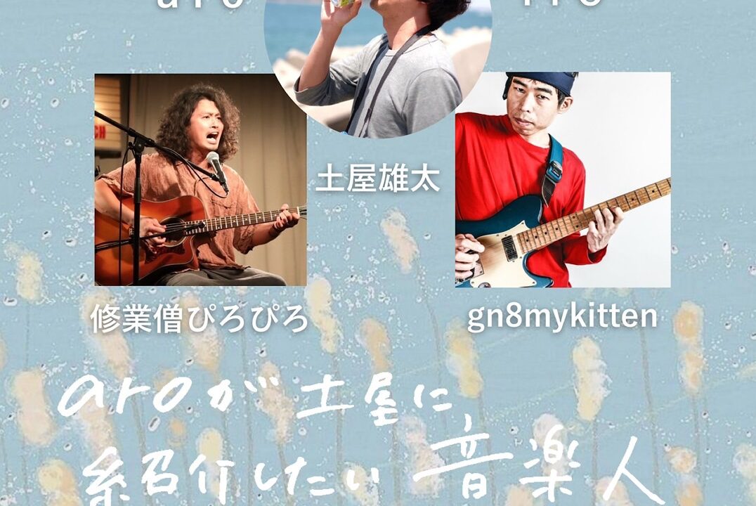 aro hijiya.1 2026年3月25日 開催日: 2026年4月7日カテゴリー: ライブ 2026/4/7 (TUE) 「aroが土屋に紹介したい音楽人」 open 19:00 start 19:30 charge ¥2,500- (+1d ¥600-) -act- aro (山梨) gn8mykitten ITO 修業僧ぴろぴろ 土屋雄太